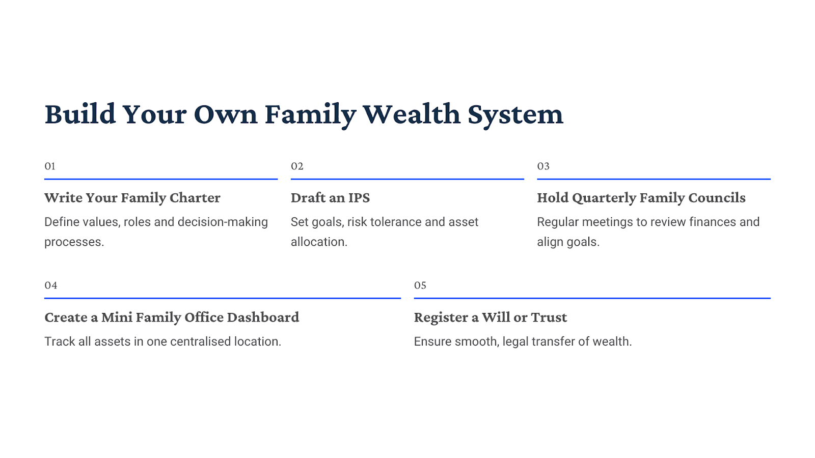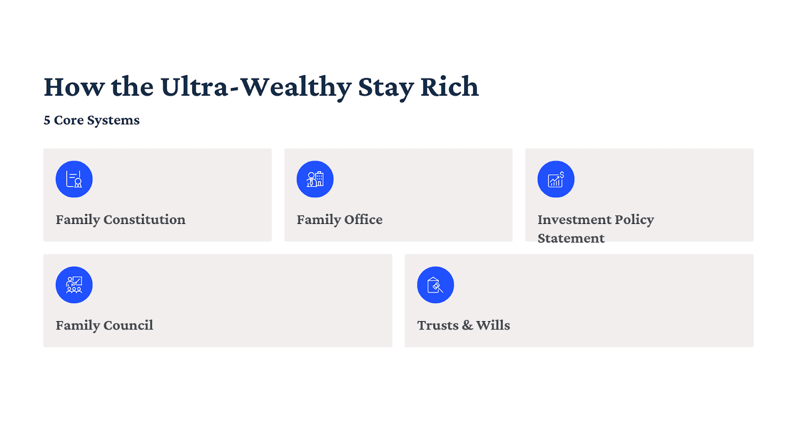For Ultra Wealthy families, these five frameworks are not fancy paperwork , they’re risk-management systems for money and relationships. Each one converts uncertainty into process, emotion into policy, and wealth into legacy.