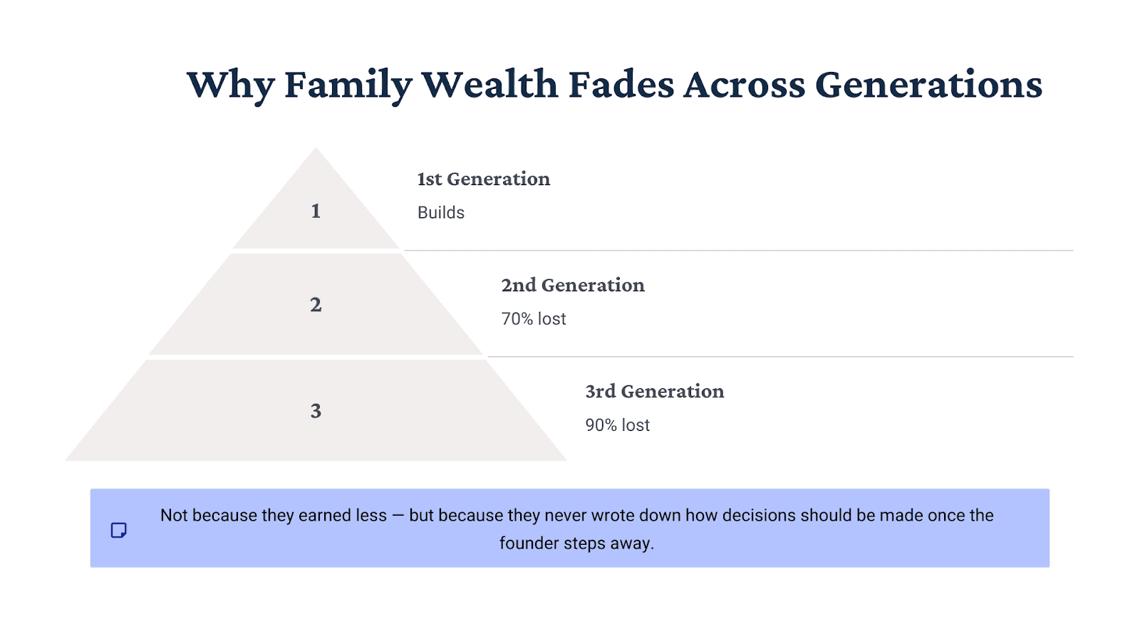 But that’s rarely how fortunes fade.Studies show nearly 70% of families lose wealth by the second generation, and 90% by the third—not because they earned less, but because they never documented how decisions should be made once the founder steps away.